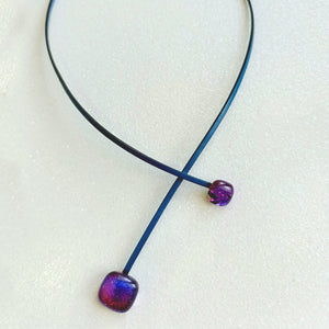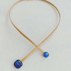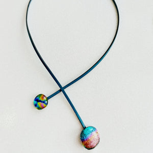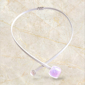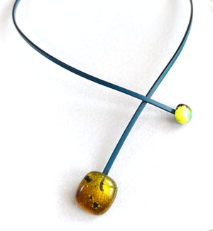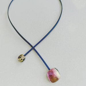 This one-of-a-kind choker necklace combines leather with two handblown glass pieces – luminous sphere, or rectangle – dancing with light and texture.